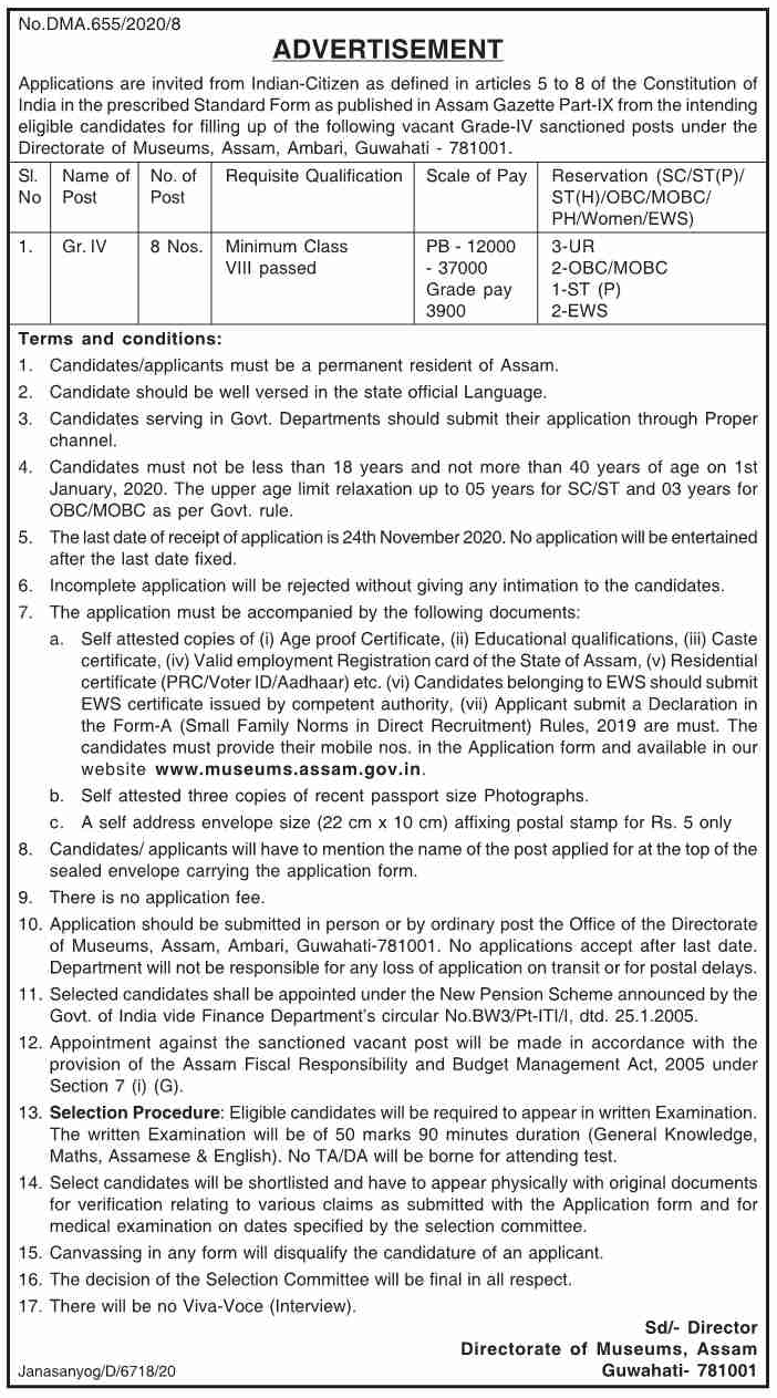 Assam Grade iv Recruitment 2020 under Directorate of Museum,Assam: Directorate of Museum,Assam invite applications from interested and eligible Indian citizen for the grade iv posts under Directorate of Museum,Assam. Assam Grade iv recruitment2020