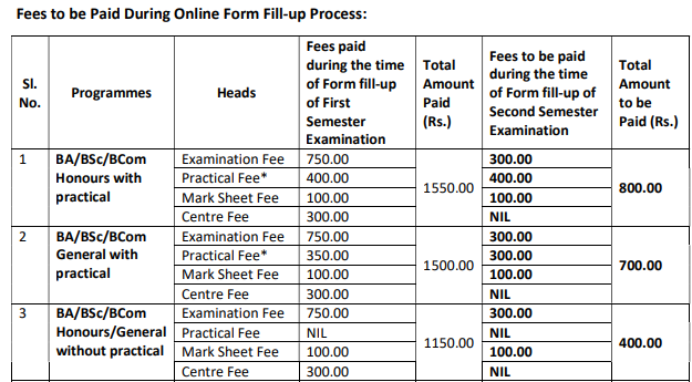 All UG 2nd semester candidates are invited to fill up their form through online on official website and the payment of fees of UG Second Semester Examination are given in the following table.