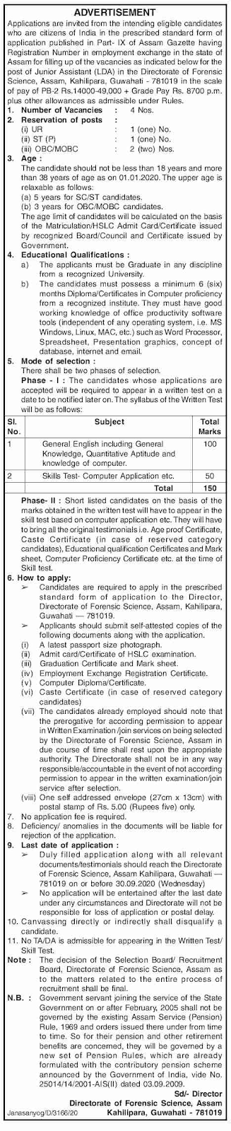 Applications are invited from interested and eligible candidates for filling up the following posts under the Directorate of Forensic Department, ASSAM. Applications have to be submitted off-line via Standard Application form Forensic Department and will be obtained with impact from 27-08-2020. The closing date of receiving application form will be 30-09-2020. No application will be obtained thereafter.