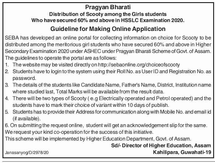 Under Pragyan Bharati Scheme 2020 , AHSEC has recently published a notice where they give Free Scooty for Girls who secured 60% and above in HS Examination 2020.